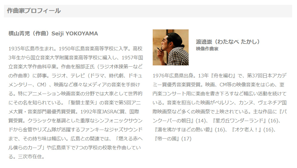広島出身で世界的人気作曲家 横山菁児が作曲を手がけるアニメ「キャプテンハーロック」「聖闘士星矢」やカープ応援歌「燃える赤ヘル僕らのカープ」など、横山氏コメント付きのCDコンサート。